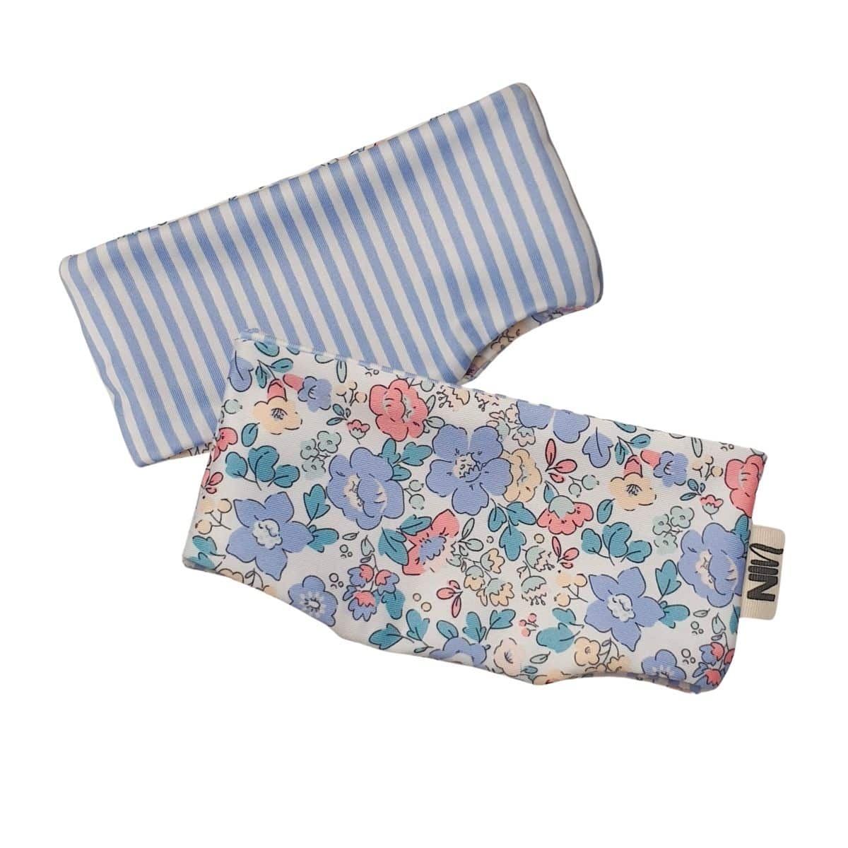 Bañador pantalón reversible en lycra de baño de flores  por un lado y rayas azul-blanco por el otro lado.