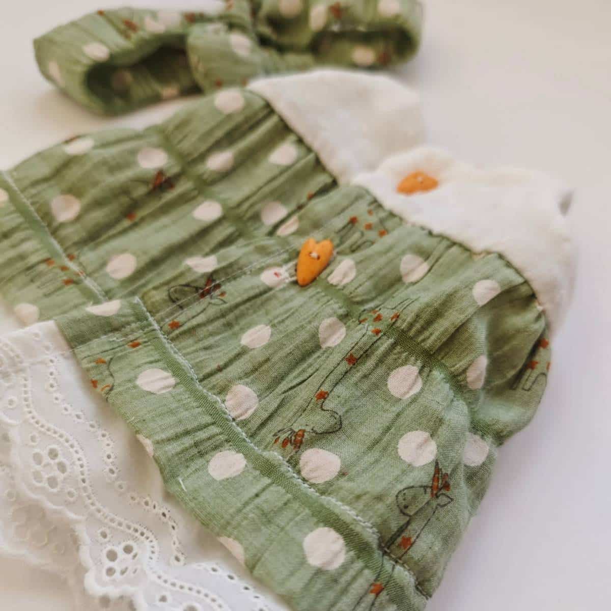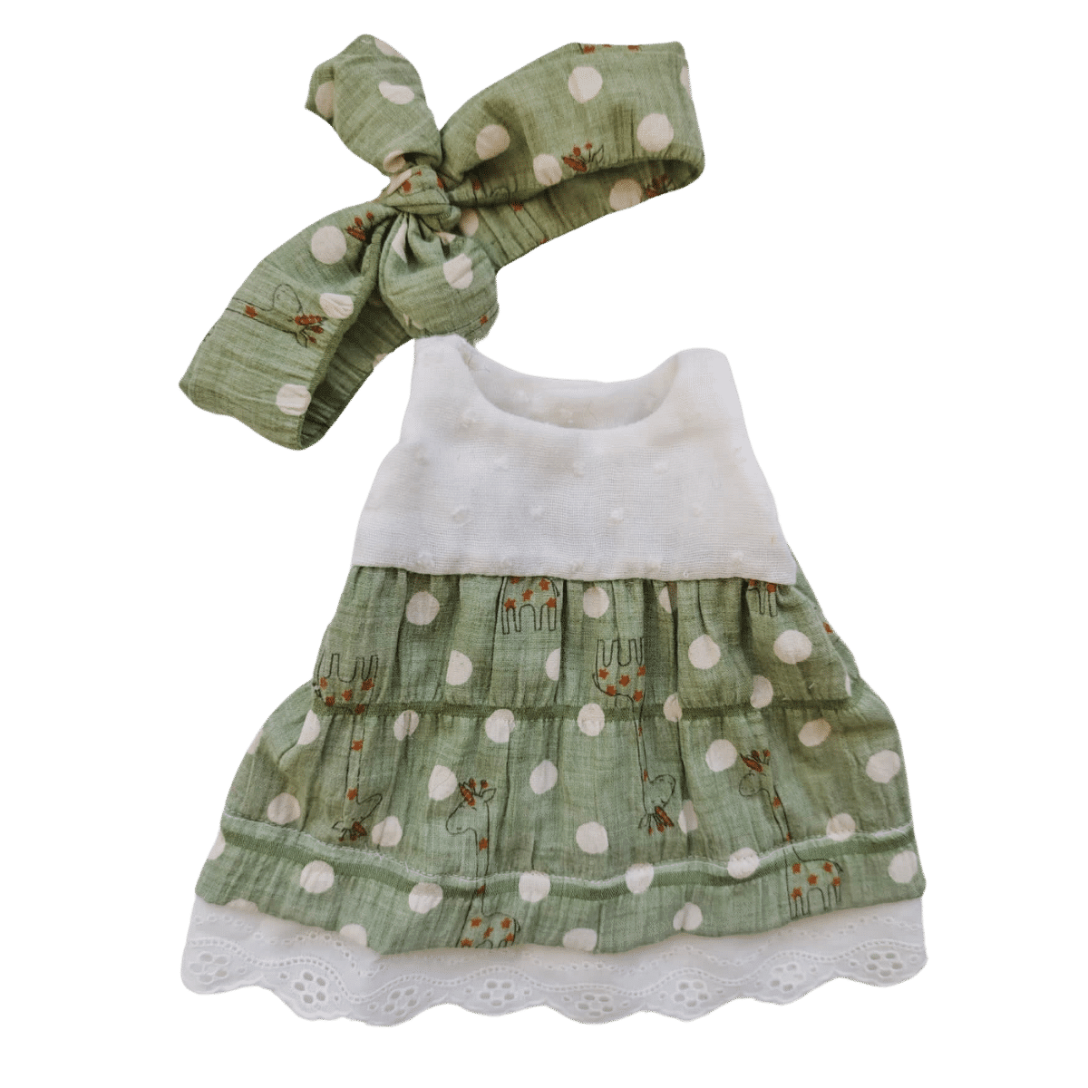 Vestido confeccionado con tela seersuker de jirafas y lunares , en su parte superior el tejido es doble gasa con topitos blancos. Lleva turbante-lazo a juego en el mismo tejido.