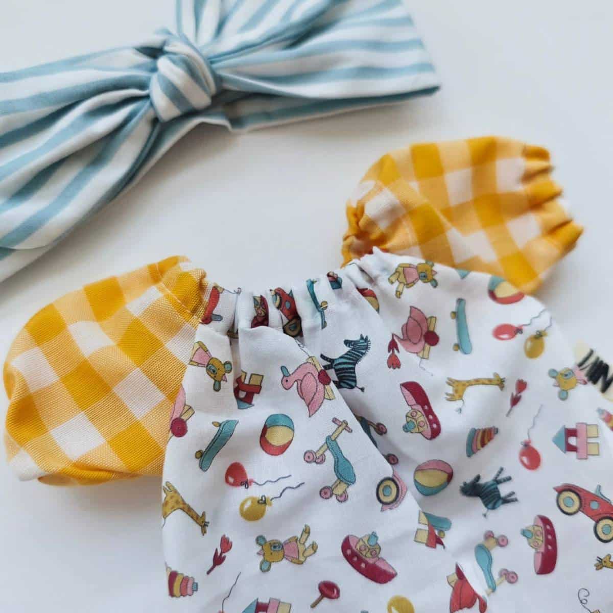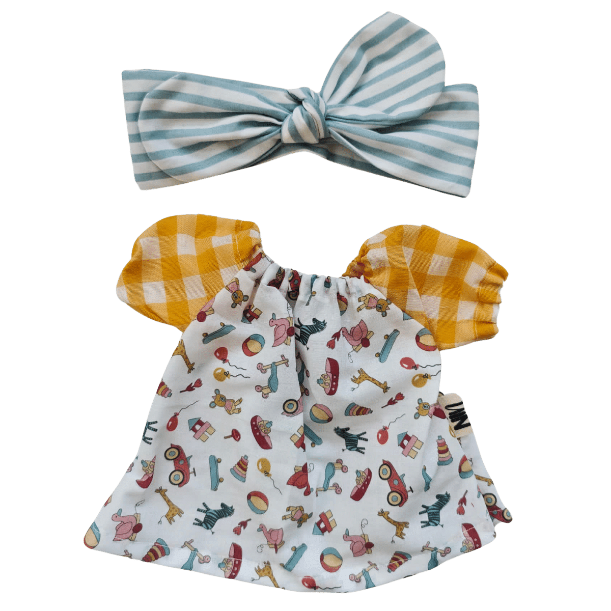 Vestido de batista con un colorido diseño de juguetes. 100% algodón con certificado Oeko-Tex® combinado con tela vichy amarilla en las mangas.