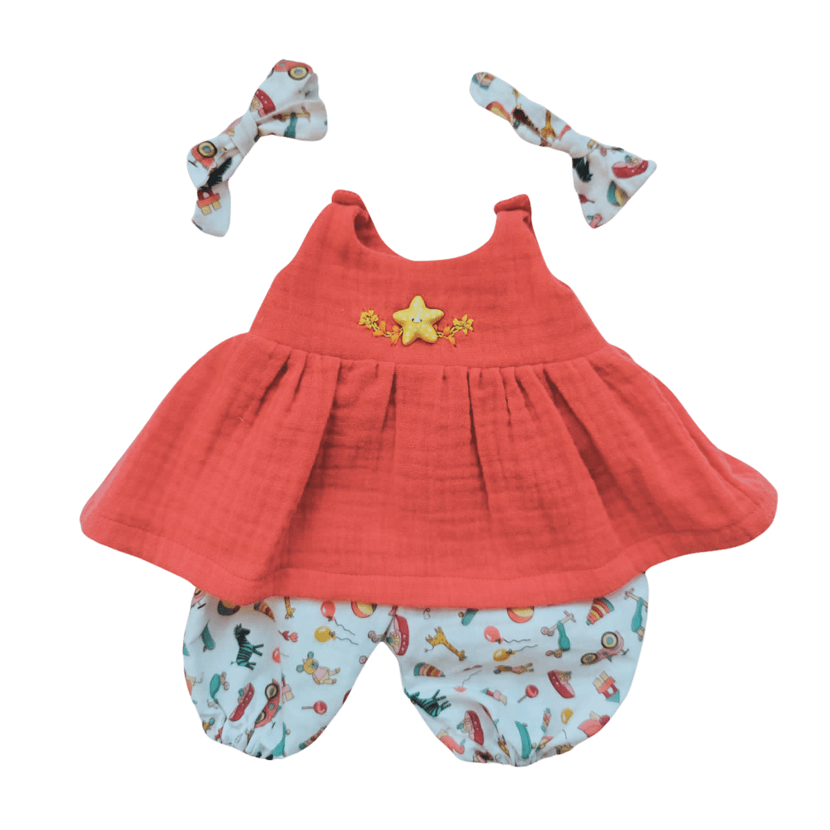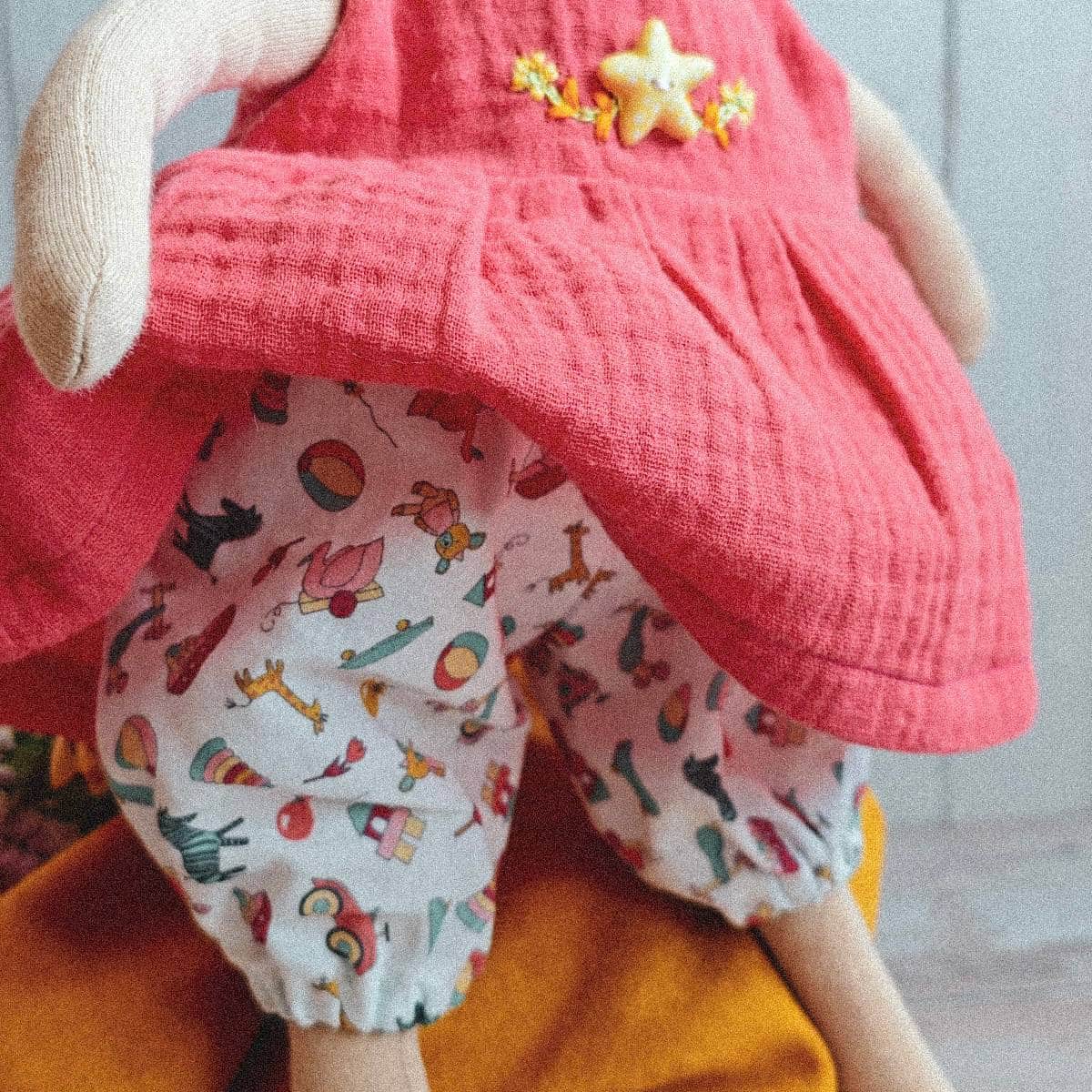 Pantalón/pololo de batista con un colorido diseño de juguetes. 100% algodón con certificado Oeko-Tex® . Incluye dos tiritas de tela para poder anudar el pelo de nuestra muñeca.