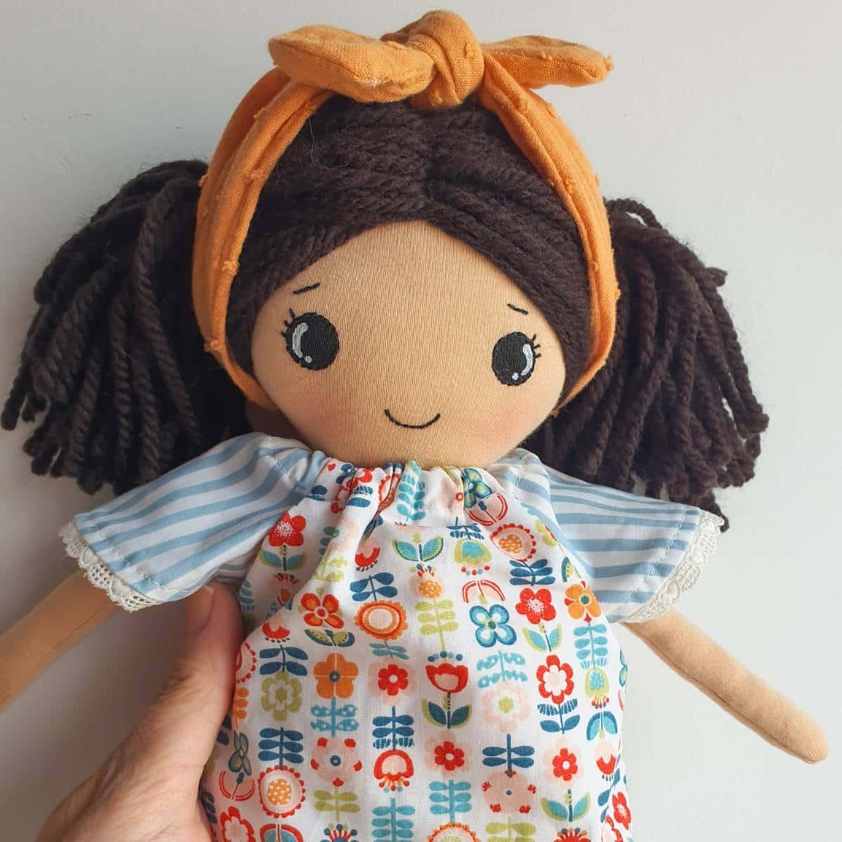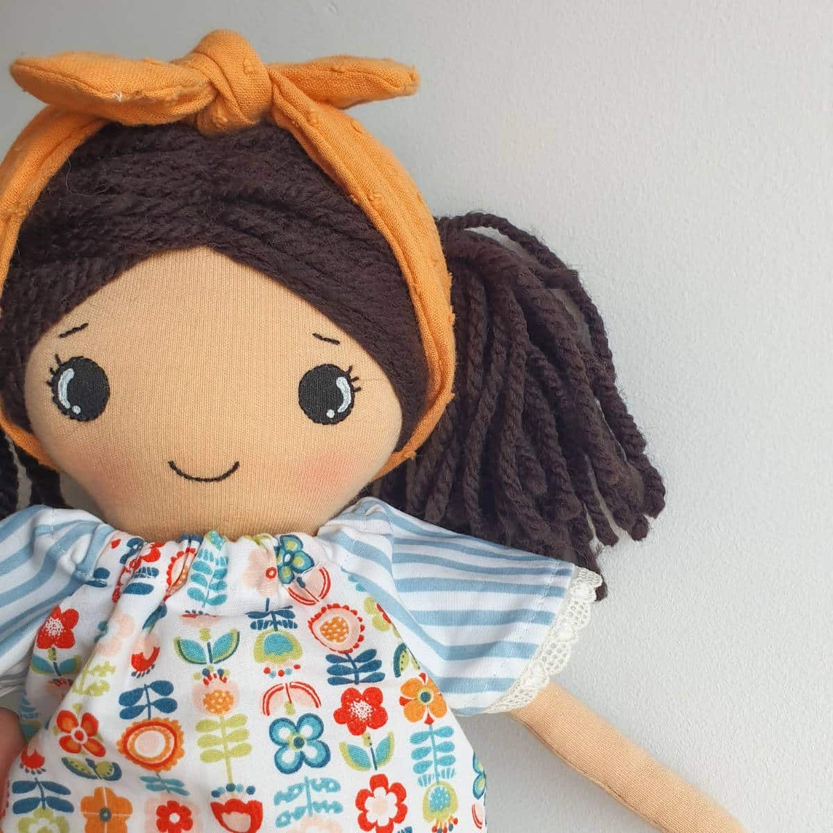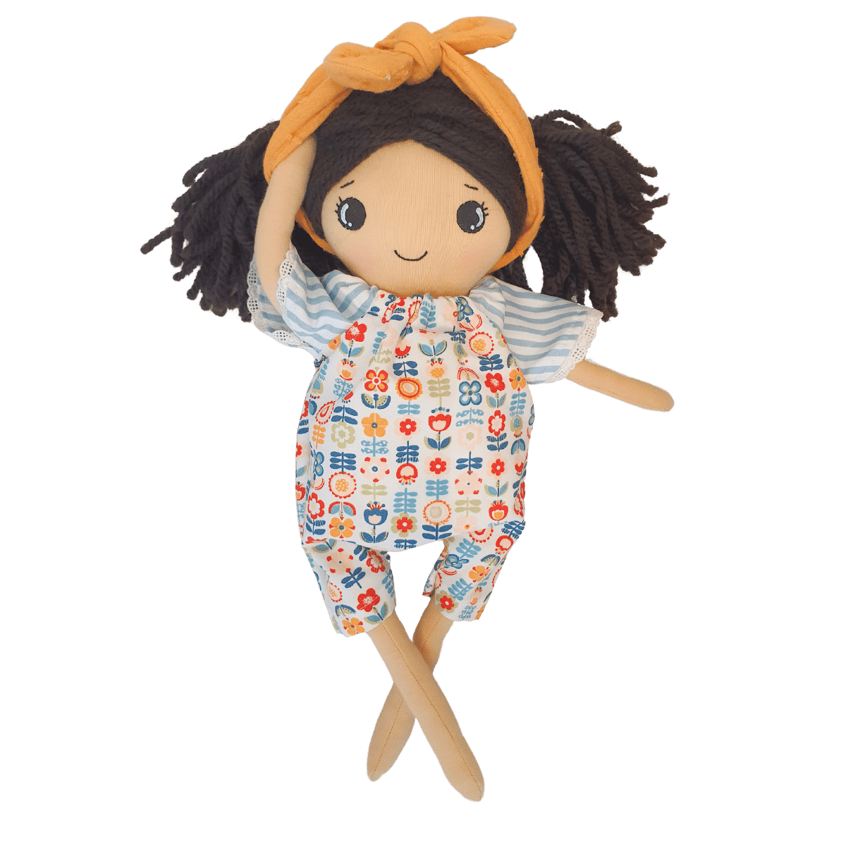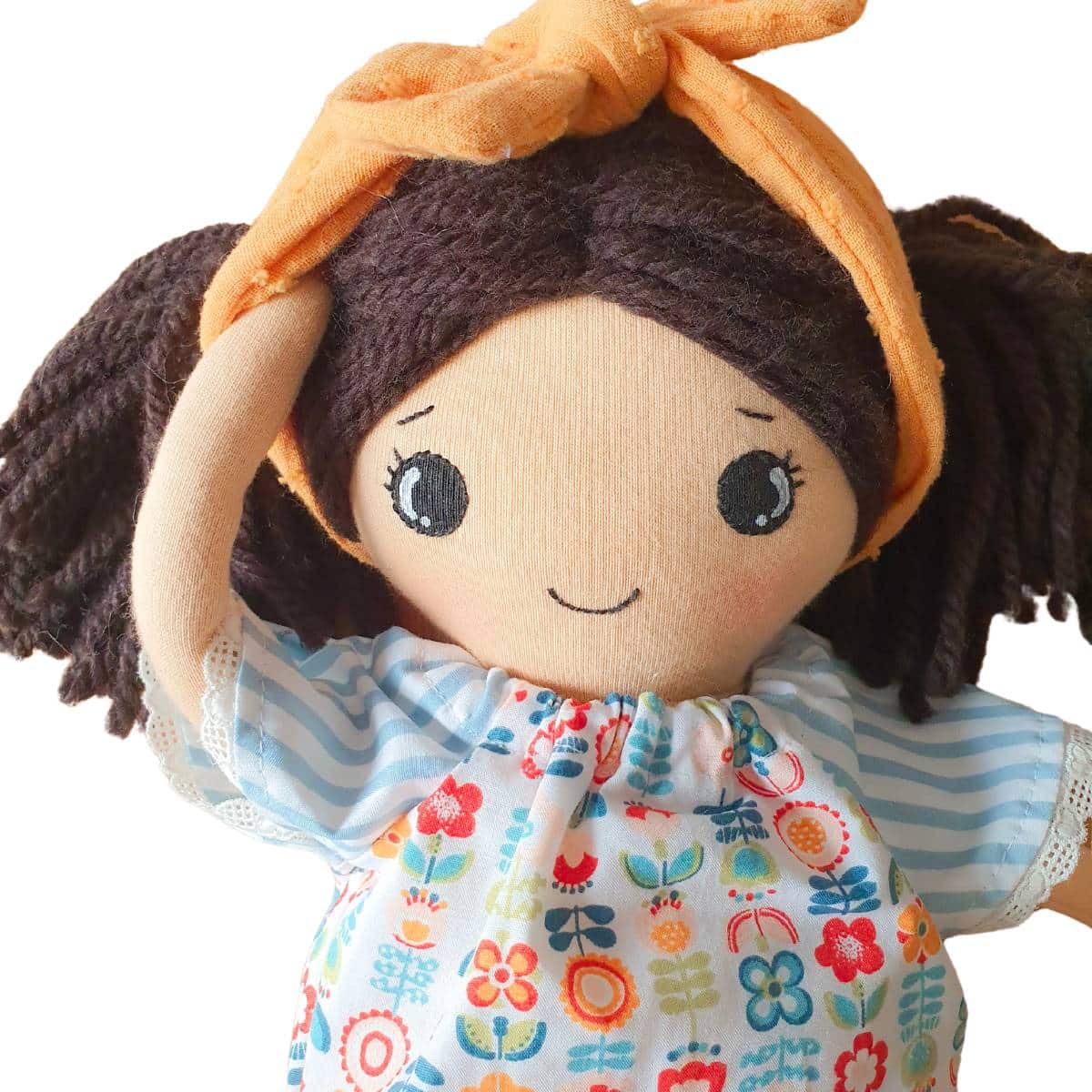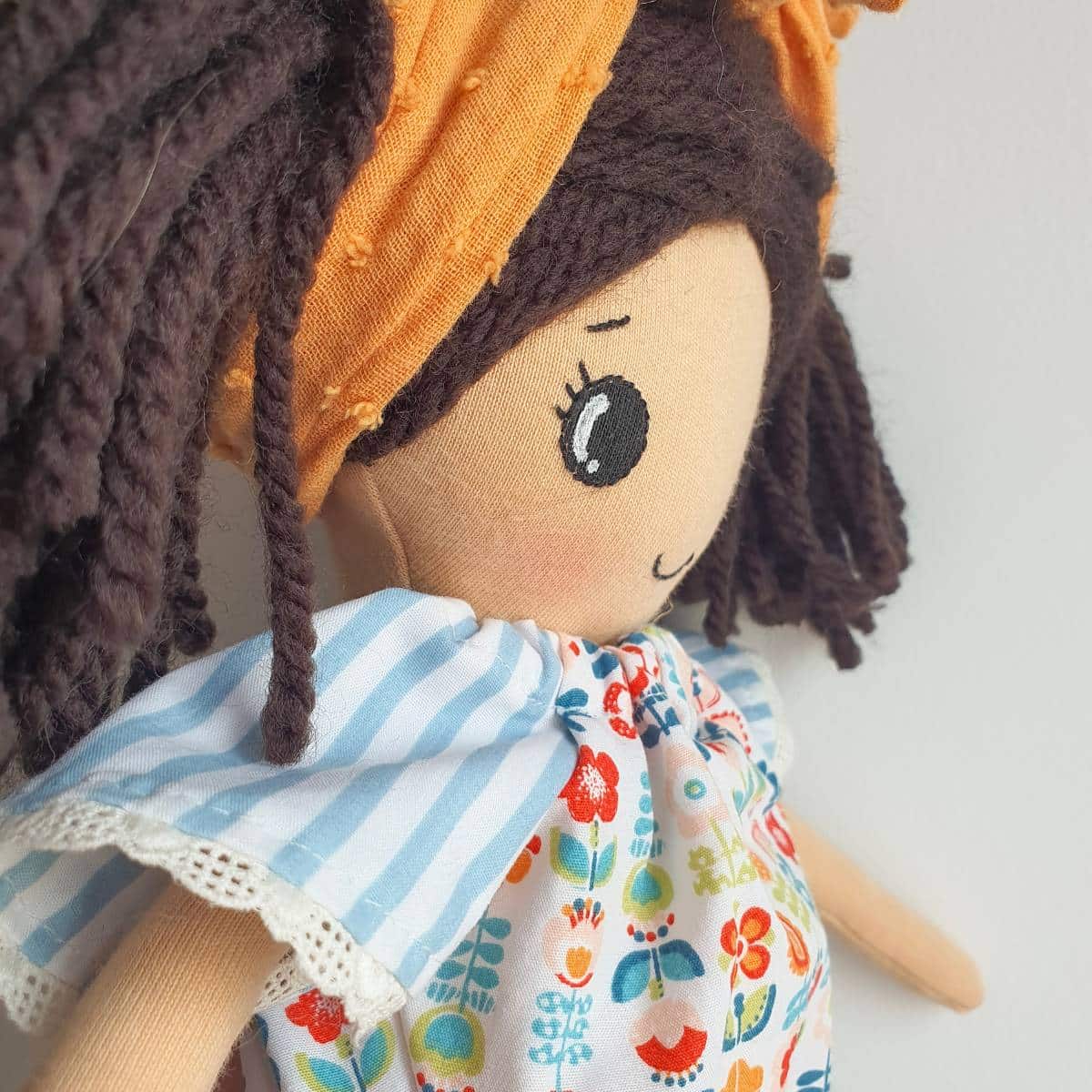 Lucía es una dulce muñeca hecha de forma artesanal. Mide aproximadamente 38 cm desde los pies hasta la parte superior de la cabeza. Su cuerpo está hecho de tela jersey y está relleno con fibra de poliéster hipoalergénica. Su rostro está bordado y pintado a mano con pincel. Y su pelo está cosido a mano hebra a hebra.