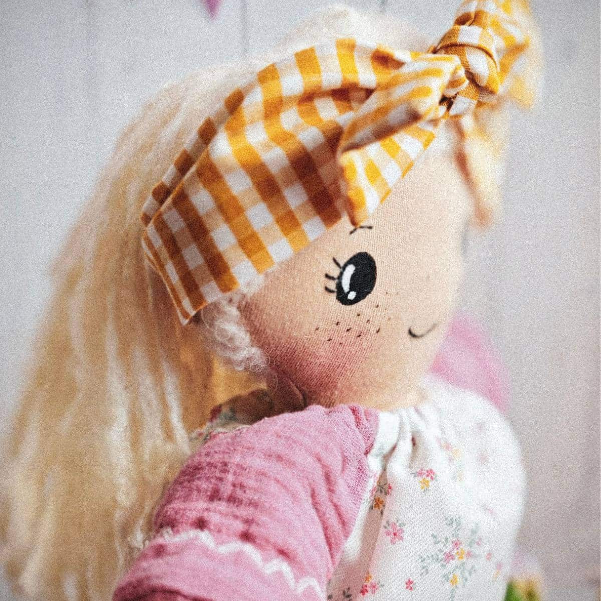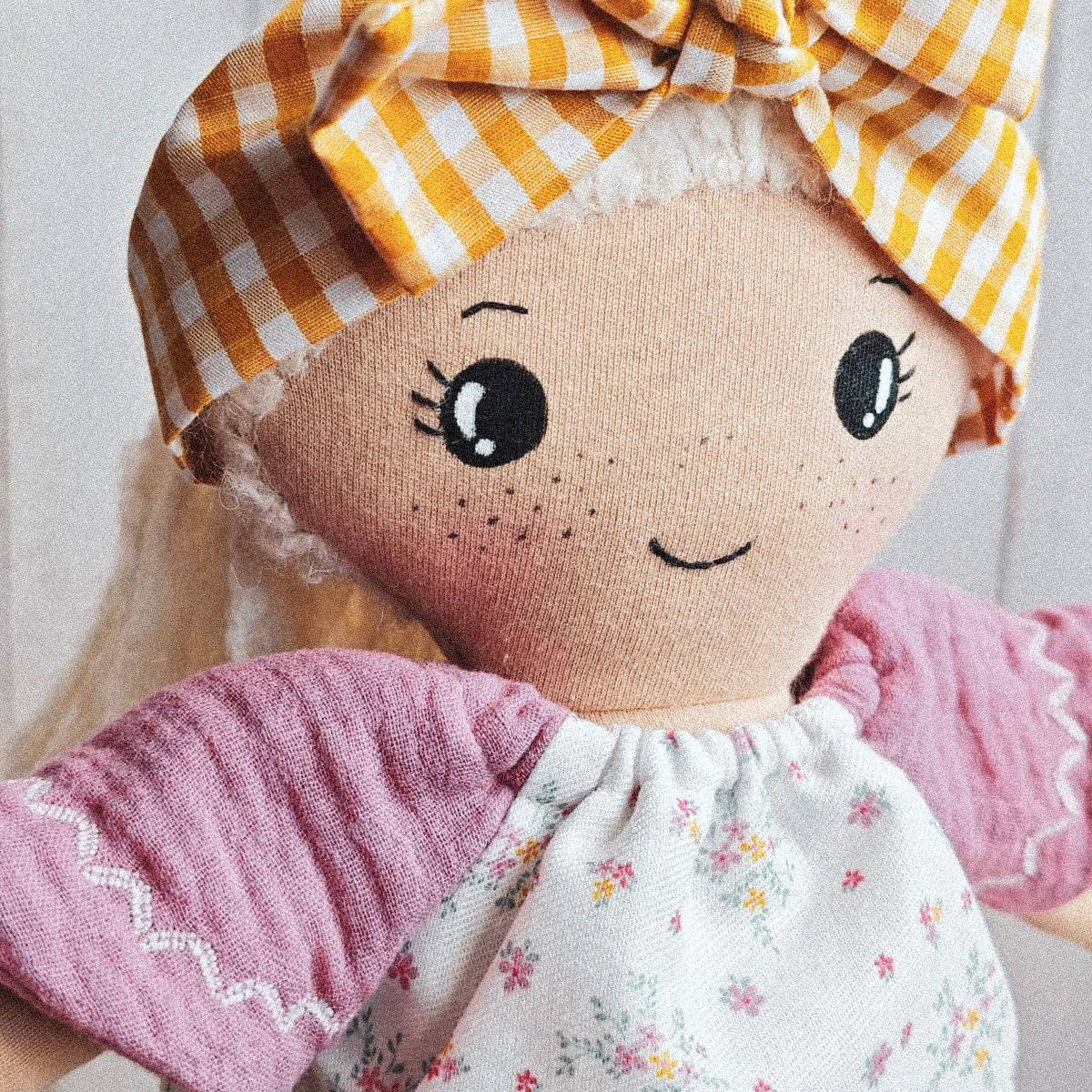 Luna es una bonita muñeca pecosa hecha de forma artesanal.  Mide aproximadamente 38 cm desde los pies hasta la parte superior de la cabeza. Su cuerpo está hecho de algodón  y está relleno con fibra de poliéster hipoalergénica. Su rostro está bordado y pintado a mano con pincel. Y su pelo está cosido a mano hebra a hebra.